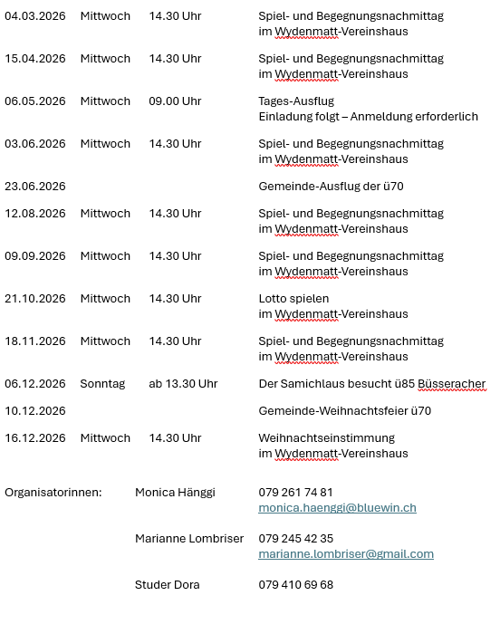 Termine Seniorennachmittage (Vereinshaus Wydenmatt)